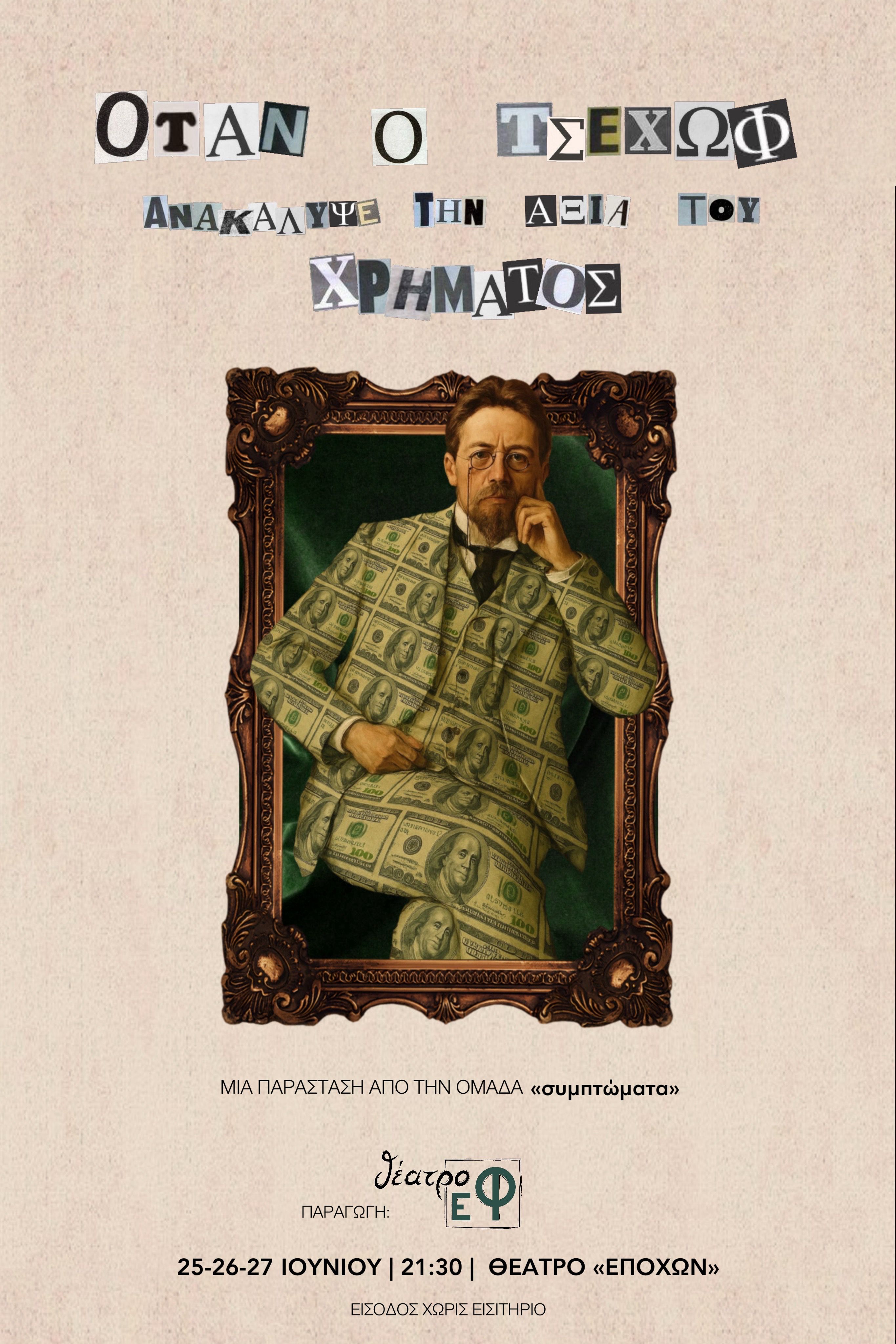 Η Ρωσία του Τσέχωφ, όπως δεν την έχουμε ξαναδεί, τόσο κωμική όσο και τραγική, μέσα από μία σειρά διηγημάτων για την αξία του χρήματος και την ακατανίκητη δύναμή του να επηρεάζει τις ανθρώπινες σχέσεις. Η ομάδα «συμπτώματα» του «θέατρο εΦ» παρουσιάζει μία κωμικοτραγική παράσταση για έναν αθώο κόσμο που σπιλώθηκε αμετάκλητα από το χρήμα.