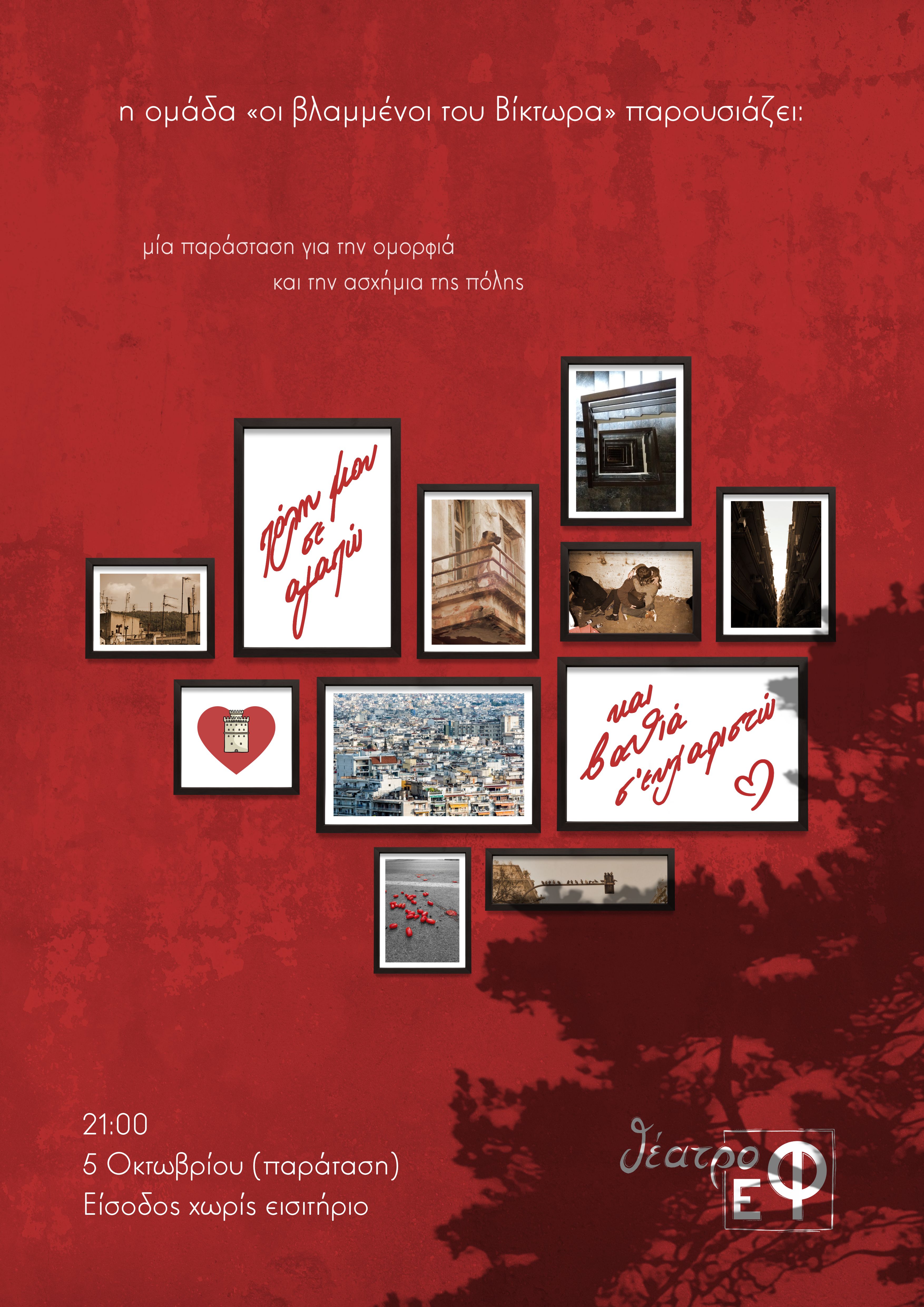 Η ομάδα «οι βλαμμένοι του Βίκτωρα» παρουσιάζει για μία ακόμη ημέρα την παράσταση «Πόλη μου σε αγαπώ και βαθιά σ’ ευχαριστώ» στις 5 Οκτωβρίου στις 21:00 στο «θέατρο εΦ».